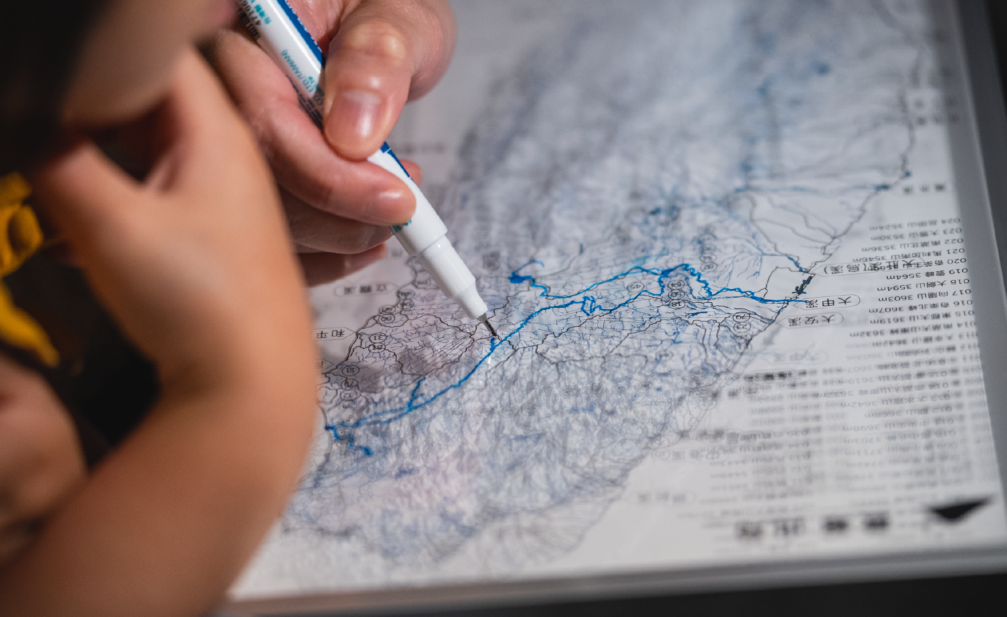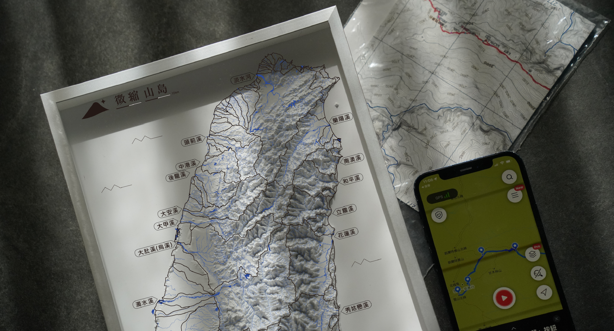 將透明壓克力圖卡輕置於微縮山島模型上,觀察山脈與河流的立體交織,同時記錄下登山與探索的足跡,融入學習與生活。